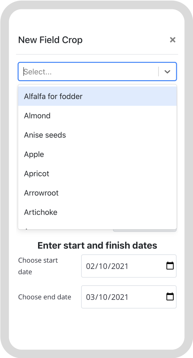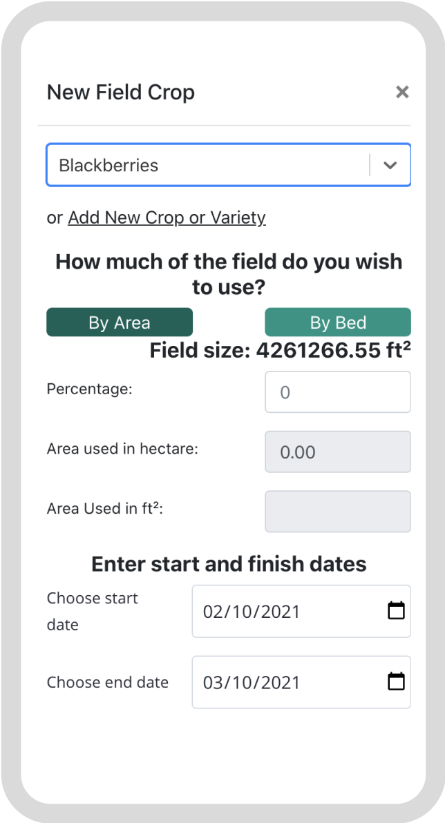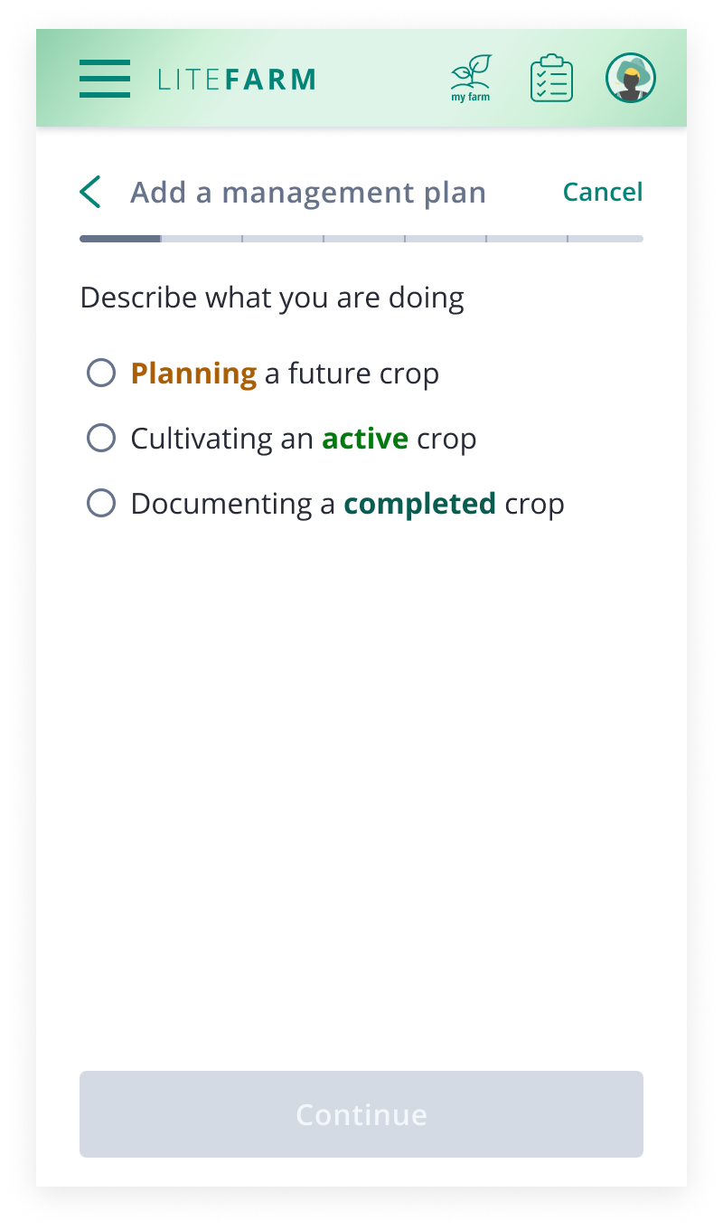 After talking to farmers and collaborating with an organic certification expert, management plans (plan) were determined to be the most intuitive way to organize information about a crop. In order to add a crop into LiteFarm, the user had to provide details on the specific variety. For each planting instance, a management plan would be automated that housed all tasks associated with a specific crop planting.