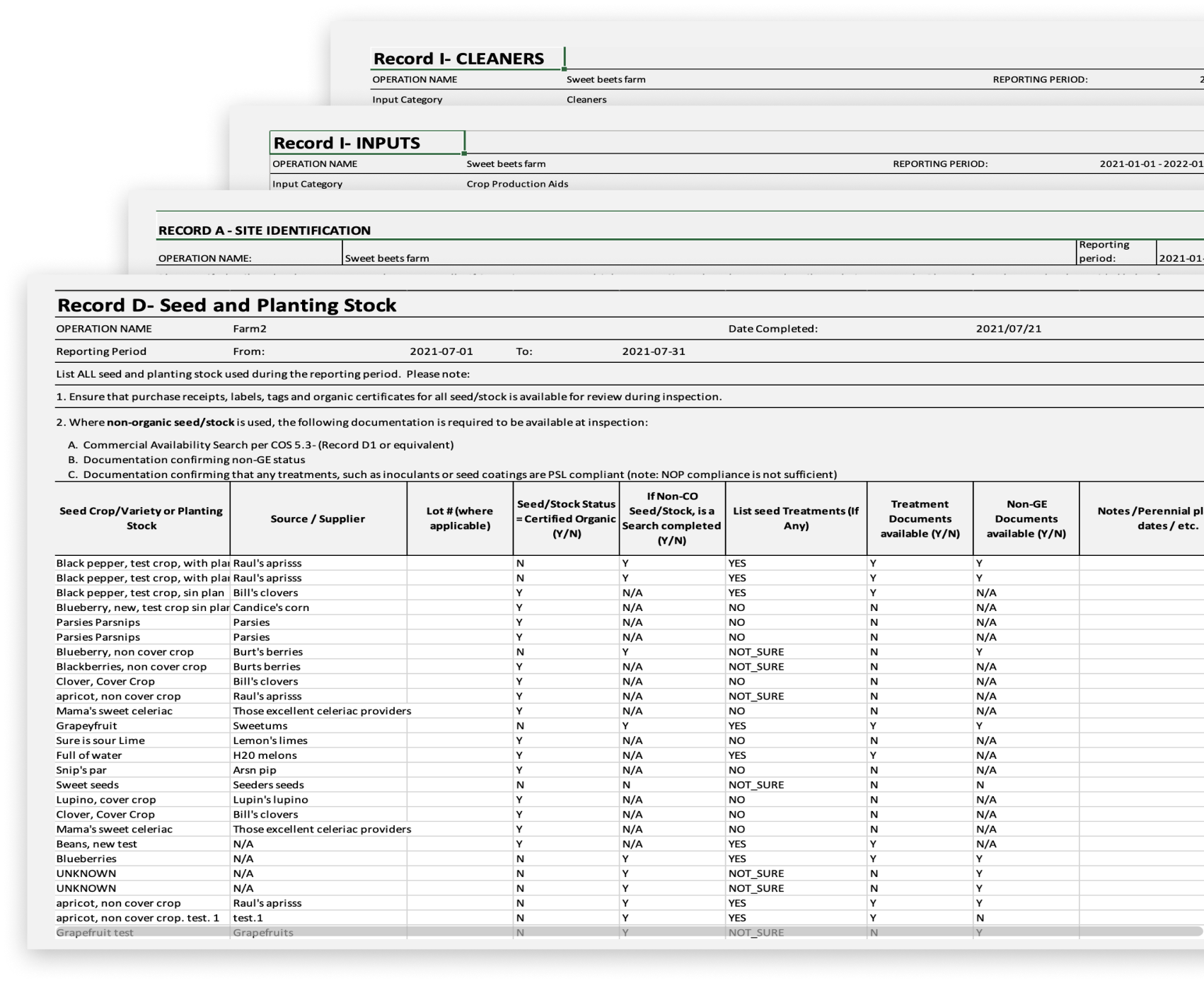 Having a certification benefits farmers in that it acknowledges their sustainable growing practices as well as provides a reason to sell their products at a premium value. However most certifiers require tedious tracking of all inputs and outputs on the farm. Farm inputs include the type and amount of seed, planting stock, fertilizer, pesticide, and soil amendments. LiteFarm needed a method to track all the information certifying bodies are looking for and auto-generate forms like the ones shown.